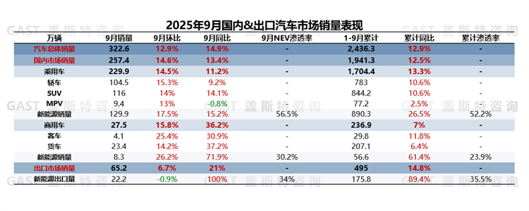 2025年9月,中国汽车市场销售322.6万辆,环比增长12.9%,同比增长14.9%。具体来看,一方面,以旧换新及地方促消费政策有效激活购车需求;另一方面,车企季末冲量期间加码车型优惠,进一步释放消费潜力;同时,新车型的持续投放也为销量增长贡献了稳定增量,多重利好因素的共振效应共同推动9月汽车市场呈现超预期增长。