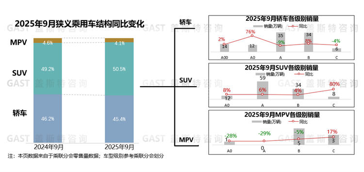 SUV份额为50.5%,同比增长1.3个百分点。主流市场同比小幅增长,A0级元UP同比增长超1万辆;A级博越L销量超2.8万辆,创历史新高,同时深蓝S05等新款车型上市形成增量贡献。B级市场稳定增长,其中Model Y销量超5万辆,方程豹钛7首月销量超8千辆。C级及以上市场同比高增长,其中蔚来全新ES8及乐道L90增量显著。