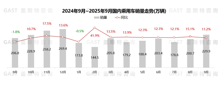 9月,国内乘用车市场销售229.9万辆,环比增长14.5%,同比增长11.2%。政策方面,八部门发布《汽车行业稳增长工作方案(2025—2026年)》,进一步加大力度促进汽车消费;供给方面,多数车企在九月初推出现金及金融权益;需求方面,各省以旧换新补贴发放节奏差异显著,区域间的销量增速持续分化。