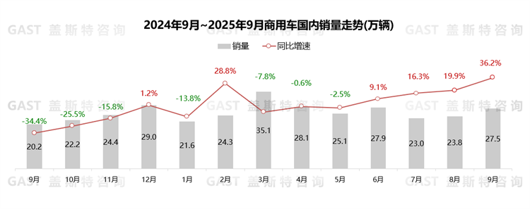 9月,商用车国内销售27.5万辆,环比增长15.8%,同比增长36.2%。受去年同期基数较低及政策推动,国内商用车市场连续四个月实现同比正增长。