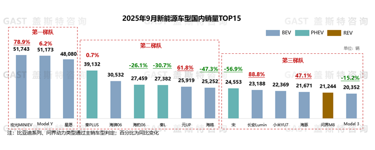 9月,比亚迪在TOP15中占据8席,仍保持断层领先。具体来看,宏光MINI EV:月销量超5万辆,创单月历史新高;Model Y:因季末集中交付,月销量重返5万辆以上;海狮06:销量稳定攀升,上市第二个完整月销量超3万辆,环比增长近20%;元UP:新版本开始上量,月销量同环比增幅均超30%;长安Lumin:凭借价格优势销量持续走高,9月销量创历史新高,同环比增幅均超50%;小米YU7:产能持续爬坡,累计订单加速交付,月销量环比实现超35%增长;问界M8:作为TOP15中唯一定价在40万级的车型,连续四个月销量突破2万辆。