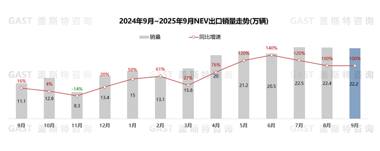 9月,汽车出口65.2万辆,环比增长6.7%,同比增长21%。从动力类型看,ICE出口量恢复同比正增长;NEV出口量同比增长1倍,NEV渗透率达34.1%。