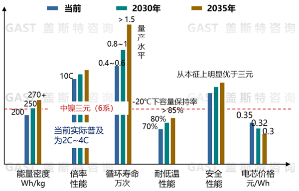 在循环寿命上,目前在2000~3000次,可满足使用需求,后续通过表面包覆、体相掺杂、充放电管理等技术,预计2035年可将循环寿命提升至5000次以上。