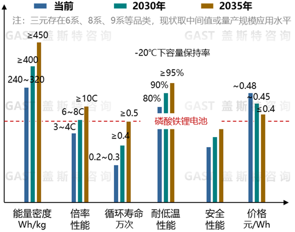 在耐低温性能上,在-20℃环境下,磷酸铁锂电池容量保持率为60%~75%。预计通过材料优化、系统级热管理设计等方案,2030年-20℃下容量保持率可提升至80%,2035年进一步提升至85%以上。