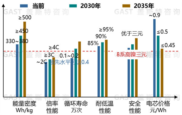 在耐低温性能上,在-20℃环境下,容量保持率可做到80%,通过材料和界面创新等方案,预计2030年后,-20℃下容量保持率有望超过90%。