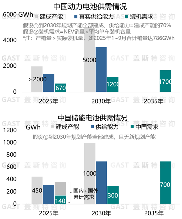 在动力电池方面,目前中国电池产能已超过2000GWh,但中国实际装机量不足1000GWh,因此过剩产能超过1000GWh。同时,若规划产能全部落地,到2030年中国动力电池产能将达到5000GWh,届时,过剩产能将超过2000GWh。
