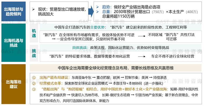 此报告指出“全产业链出海+本地化运营”是必选路径。预计2030年中国汽车出海总量将突破1150万辆,其中贸易型出口750万辆,本地化生产400万辆。研究特别提出,“新汽车”属于在全球市场的共性需求,只是各地发展时间节奏不同,中国车企在此方面建立了阶段性领先优势,又兼具工程师红利,但同时面临海外政策法规、国际化运营、场景数据本地化要求等挑战,因此中国车企需以全球化经营与布局的长线思维,“借船出海”与“报团取暖”相结合,短期依托共性技术与产业链优势快速切入海外市场,长期通过生态培育引领当地产业发展,以新合资理念构建国际化运营能力体系。
