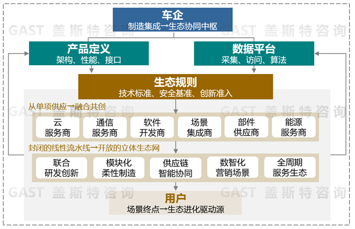 在生态化发展中,车企作为生态协同中枢,主导产品定义和数据平台搭建,并制定生态规则;供应商从单项供应升级为融合共创,深度参与产品研发、制造等全链条;用户是生态进化的驱动源,用户对产品使用的需求持续推动企业迭代服务。这种生态化局面并非一蹴而就或短期内即可达成的,需要整供企业持续推进和开放共享,每家企业需要找准自身的生态位置,明确核心能力和关键作用,做到“有所为”和“有所不为”。不同主体在开放合作中,基于专业能力分工,在合作中共赢、共享中获利。