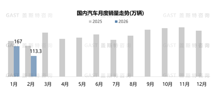 盖斯特观点:开年国内汽车市场出现预期内下滑,本质是政策调整、用户消费意愿低迷等因素叠加造成的短期市场波动。后续随着地方购车补贴与国家政策形成合力,再加上春季车展等活动带动消费需求释放、车企产能恢复与新品供给增加,市场有望逐步回暖。预计3月国内汽车销量环比将明显改善,二季度市场有望回归常态化增长。