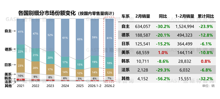 同比销量角度,2月仅美系销量实现正增长,自主品牌销量同比降幅超过30%。