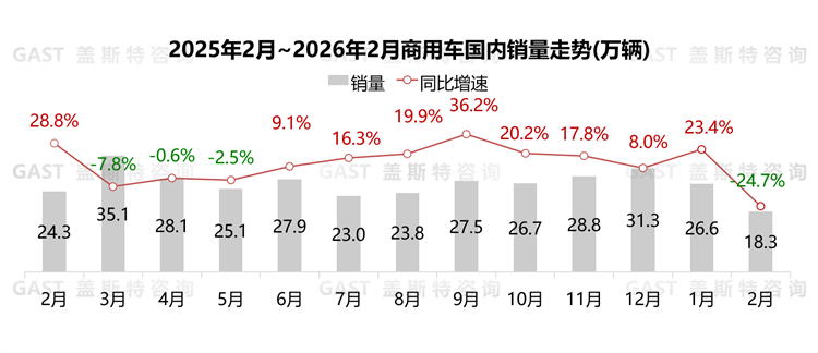 2月,商用车国内销售18.3万辆,环比下降31.3%,同比下降24.7%。受春节假期影响,物流运输活动放缓,客车采购需求走弱,整体商用车市场同环比双双下滑。