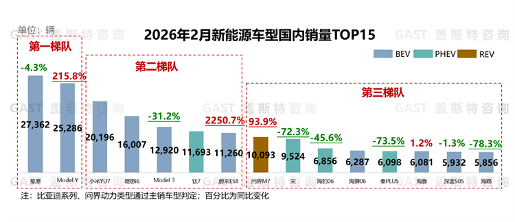 2月,TOP15车型中纯电占据10席,处于绝对主导地位,其中TOP5均为纯电车型。具体来看,吉利星愿:受极狐T1等竞品增多及政策退坡影响,月销量连续5个月环比下滑;Model Y:依托限时金融优惠政策,月销量同比超2倍增长;小米YU7:订单稳定增加,全部产能释放,月销量稳定在2万辆以上;理想i6:订单储备充足且产能持续爬坡,月销量连续3个月稳定在1.6万辆左右;蔚来ES8:全新蔚来ES8产品力升级且价格下调,连续四个月单月销量破万;问界M7:新款车型上市后订单稳步增长,2月同比增长超90%;比亚迪旗下宋系列、秦PLUS等车型处于产品切换周期,月销量同比下滑超70%;深蓝S05:推出限时优惠政策,月销量环比上升11%。
